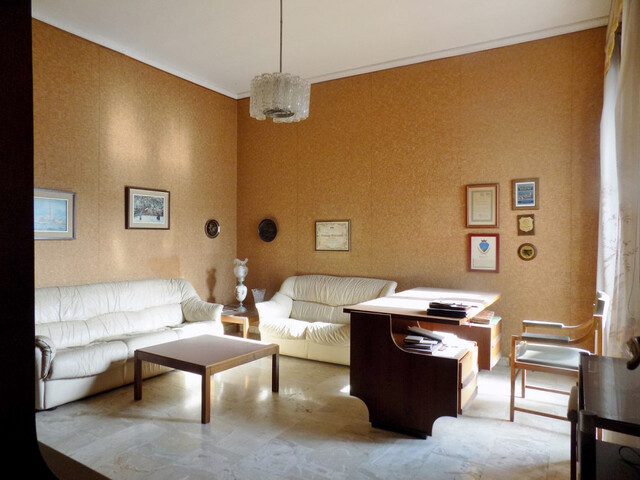 First Floor (225 sqm): entrance hall, large and sunny representative living room, followed by a sitting room, charming bathroom with shower, hallway, dining room with adjacent eat-in kitchen, master bedroom, additional bedroom or study, bathroom with bathtub, and balconies with views over the historic center.